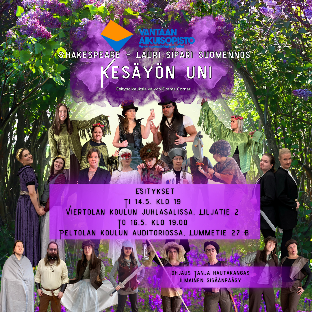 Vantaan aikuisopiston Teatteri-esityskurssi esittää William Shakespearen näytelmän "Kesäyön uni".