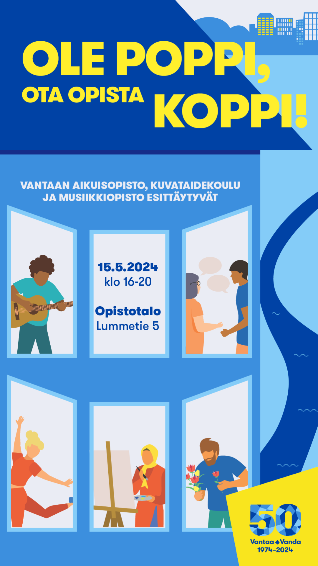 Ole poppi, ota opista koppi! -tapahtumassa Vantaa-päivänä keskiviikkona 15.5. klo 16–20 Tikkurilan Opistotalolla pääset tutustumaan Vantaan kaupungin elinikäisen oppimisen mahdollisuuksiin, kun oppilaitokset esittäytyvät.