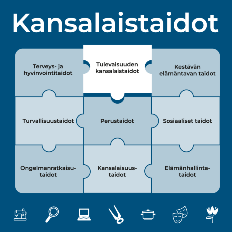Kansalaistaitoihin sisältyvät perustaitojen ja digitaitojen lisäksi myös esim. vuorovaikutus-, kestävyys-, oppimisen taidot ja hyvinvointiosaaminen.
