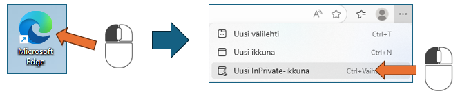 Avaa selain. Kuvan esimerkissä on käytetty Microsoft Edge -selainta. Selaimen oikeasta yläreunasta löytyy kolme pistettä, jota painamalla saa auki valikon. Paina valikosta kohtaa ’Uusi InPrivate-ikkuna’. (Huom! mobiiliversiossa valikko saattaa löytyä myös oikeasta alareunasta). Yksityisyystilaa voi käyttää myös muilla selaimilla.