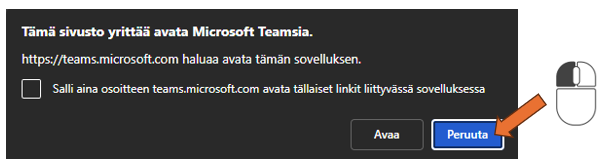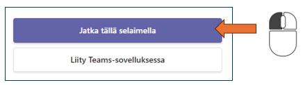 Sinulla on nyt kaksi vaihtoehtoa, kuinka haluat liittyä Teams-tapaamiseen. Valitse ’Jatka tällä selaimella’.